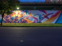 This photo captures a night scene in Taipei, Taiwan. The image features a profile mural on the side of a street near a bridge. The dark sky above contrasts with the bright lights coming down onto the roof. The wall is covered in vibrant graffiti, adding a playful and artistic touch to the scene. The road and asphalt path lead to a park in the distance, creating a sense of recreational space. This photo represents the vibrant street art culture in Taipei, showcasing the creativity and energy of the city.