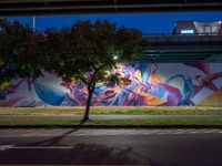 This image showcases a colorful mural under the highway at night on an overpass in Taipei, Taiwan. The vibrant graffiti wall stands out against the dark backdrop, creating a striking contrast. The clear sky above provides a peaceful atmosphere. The road and street lights illuminate the scene, adding to the urban ambiance. This photo captures the unique street art culture and recreational spaces in Taipei, emphasizing the city's creativity and vibrant energy.