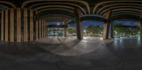 A modern skate park in Taipei, Republic of China. Futuristic architecture with arches and benches create a unique urban design. The fountain in the foreground adds a touch of artistic flair to the city landscape.