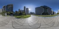 A view of modern architecture in Taiwan's cities. The clear sky highlights the urban design and open spaces. Straight roads with hard shadows lead to bustling shopping areas. A unique perspective on city life in Taiwan.