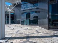 a view of an empty courtyard in front of a building with windows on a sunny day