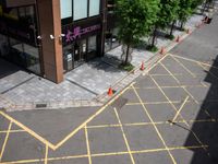 A view of a modern urban plaza in Taipei, Taiwan. The elevated open space features a combination of asphalt road surfaces and composite flooring. Trees line the curb, adding greenery to the city. A perfect spot to eat out and enjoy city life.