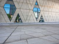 a sidewalk in front of an art museum with geometric windows and concrete tiles on the side of the building