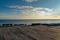 an empty wooden deck overlooking the ocean on a sunny day with the sun setting behind