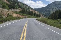 A winding mountain road leads through the picturesque landscape of Telluride, Colorado. The road surface of asphalt glistens in the sunlight. Towering forests and majestic mountains create a breathtaking backdrop. Experience the thrill of driving on this dangerous but beautiful highway.