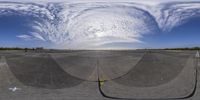 a mirror view of an airfield with blue skies and white clouds around it with a person in the air