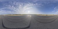 A wide-angle fisheye lens captures the expansive open landscape of Tempelhof in Berlin. The asphalt field stretches out towards the horizon, surrounded by trees and grass. The clear sky and calm atmosphere provide a serene backdrop for city life.