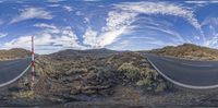 two panoramas of a desert with a paved road and mountains in the background, and sky painted in blue