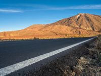 an empty road and the mountains in the background at sunset with a white line on the road