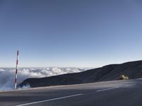 a road leading into the clouds, with a stop sign in the foreground and a mountain in the back