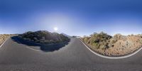 A scenic mountain road in Tenerife, Spain, winding through the rugged landscape with breathtaking views. The sun shines brightly in the clear sky, casting a golden light on the asphalt. An elevated road trip over the clouds.