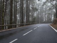 A low-lying road in Tenerife, Spain, covered with wet asphalt. The gloomy and foggy landscape creates an emotional atmosphere. The grey sky adds to the overall sense of gloom.