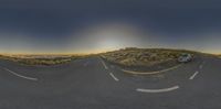 a picture of a car driving on a curved road under a skylight above a mountain