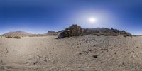 Breathtaking view of Tenerife's rugged mountain range. The desert-like landscape features rocky outcrops, gravel tracks, and open spaces. Clear skies and a fish-eye lens capture the beauty of Europe's natural environment.