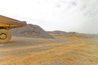 the large dump truck is driving around a gravel field outside of a construction site in front of some large rocks