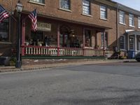 the street is in front of an old house with american flags on it and a trashcan next to the sidewalk