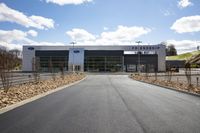 a modern ford dealership under a cloudy sky with white clouds and dirt on the floor