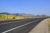 This stock photo features three yellow and white road signs near a highway, with a beautiful mountain landscape in the background. The signs are placed in front of them, creating an interesting composition. The image captures a typical day scene with the clear sky and green grass surface. The road signs indicate the direction and provide important information for drivers on this asphalt road. The mountainous terrain and lush green field add a natural touch to the landscape. The picture showcases the infrastructure and road surface of a rural area in Thailand, highlighting both the beauty of nature and the path of the thoroughfare.