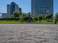 A daytime view of Tokyo's bustling business district with modern architecture and office buildings. The clear sky highlights the urban design and surface of the city. Experience the vibrant city life in Japan.