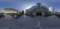 an artistic view of a courtyard in an modern city setting with buildings on either side