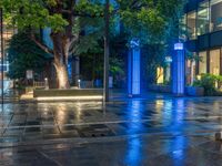A view of a wet and illuminated street in Tokyo's Nihonbashi district. The city comes alive at night with vibrant storefronts, street lights, and urban design. The paver road glistens with artificial light reflecting off the water. An urban masterpiece.