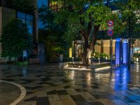 A wet night in Tokyo's city center. The streets of Nihonbashi are illuminated by street lights, creating a vibrant urban atmosphere. Storefronts and shops line the road, showcasing the city's urban design.