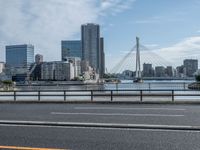 In Tokyo, Japan, a modern urban cityscape with a skyline dominated by bridges and Armco barriers. The asphalt road under a clear daytime sky showcases the city's contemporary architecture.