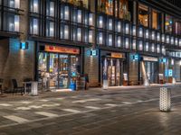 A vibrant night scene in Tokyo, Japan's bustling city. Modern architecture and urban design come to life with brightly lit office buildings, restaurants, and storefronts. The city's paver roads and street lights add to its lively atmosphere.