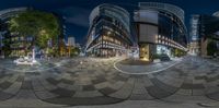 A view of the bustling city life in Tokyo, Japan. The city streets are illuminated by artificial lights, casting a modern ambiance. Office buildings and storefronts line the roads of the vibrant business district, providing plenty of dining options. The dawn breaks over the urban landscape.