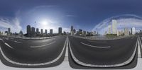 three panoramic images show the sun setting over a highway with lots of empty parking lots and the skyline in the background