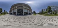 a fisheye lens with some circular shapes in the foreground and an office building
