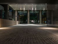 A straight road in Tokyo, lined with modern architecture and illuminated by artificial light. The dark night sky contrasts with the vibrant city life. Urban design blends seamlessly with cobblestone pavements, creating an open space atmosphere.
