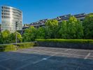 A 360-view of Tokyo's urban landscape, featuring a circular building against a clear blue sky. Shadows cast by trees add depth to the scene. The open space and straight roads showcase the city's urban design.