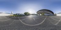 a view of the parking lot from a fish eye lens, including an oval driveway
