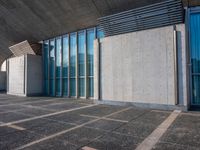 a sidewalk that has several glass doors next to it with buildings in the background behind