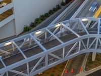 This stock photo features a bridge in the city of Los Angeles at night time. There are cars passing underneath the bridge on the road. The image is taken from a high position, providing an elevated and top-down view. The artificial lights illuminate the scene, creating a beautiful cityscape. The road is made of asphalt and there is a parking deck visible in the background. The photo captures the essence of urban life in Los Angeles, USA during the break of day, with the dawn light shining in the sky. The bridge and road are surrounded by residential areas and suburban streets, with street lights and driveways. This image can be used to represent transportation, urban infrastructure, and city living in Los Angeles, USA.