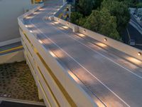 An elevated view of a curved asphalt road in Los Angeles. The top-down perspective captures the dawn light and suburban surroundings. Street lights illuminate the high-positioned road, leading to a parking deck.