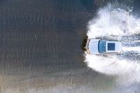 This aerial shot captures the scenic beauty of a small boat sailing on the river in California, USA. The boat creates white spray as it glides through the water, adding a dynamic element to the composition. The elevated viewpoint offers a high position perspective, allowing for a captivating top-down view of the suburban surroundings. The open space and wet environment create a serene atmosphere, perfect for a peaceful day on the water. The image showcases the vibrant suburban landscape of California, with the iconic city of Los Angeles in the distance.