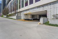 a sidewalk with an entrance to a car park and a building that has graffiti all over the side