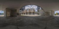 a picture looking through a fish eye lens at a large building in an empty parking lot