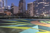 Aerial view of Toronto's vibrant art district at dawn. Modern high-rise buildings and condominiums surround an open parking lot with colorful graffiti designs. The clear sky contrasts with the artificial light illuminating the city. A captivating snapshot of urban life in Canada.