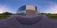 a reflection image shows the exterior of a building on the grass and in front of the sky