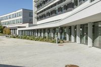 A modern architecture condominium building in Toronto's business district. The sleek facade and open spaces create a vibrant urban atmosphere. Clear skies highlight the city's dynamic city life and the well-designed walkways and plazas. A quintessential mix of business and urban design.