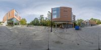 two buildings next to each other in an empty lot with no trees on top and no cars