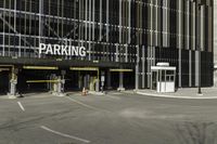 a parking garage with an entrance to it and some vehicles parked in the area behind it