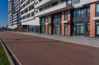 This image captures the urban landscape of Toronto, Canada. The photograph shows an empty road lined with buildings in the business district. The clear sky above adds a sense of openness to the scene. The road surface, made of asphalt, leads towards a grassy area and a brick sidewalk. The architecture of the buildings features different facades, with windows and wood accents. This photo represents the dynamic urban design of Toronto's business district and the bustling atmosphere of the city. It showcases the blend of residential and commercial properties.