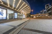 A modern architecture building in the heart of Toronto's business district. The facade is lined with artificial lights, illuminating the courtyard and plaza. A vibrant city life at night.