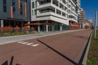 an empty street next to a residential building with balconies and a sidewalk on each side