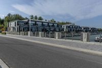 a large gray apartment complex sitting beside the water near a waterway with boats in it