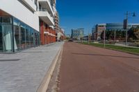 A bustling city street in Toronto, Ontario, Canada. Clear skies highlight the modern urban design of the business district. Office buildings line the road, while trees and residential areas add a touch of nature.